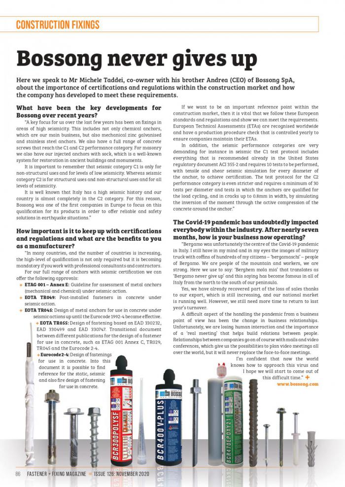 Bossong su Fastener + Fixing Magazine, Novembre 2019
