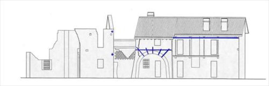 Successivamente alla preventiva e temporanea messa in sicurezza degli elementi strutturali più compromessi e alla rimozione di tutte le parti pericolanti degli edifici a nord, si è proceduto al consolidamento statico delle strutture esistenti; gli interventi sulle strutture in elevazione, costituite perlopiù da muratura mista listata in mattoni e pietra, hanno mirato principalmente a legare le pareti che presentavano sconnessioni e dissesti tali da non garantire la sicurezza durante le fasi di intervento successive.