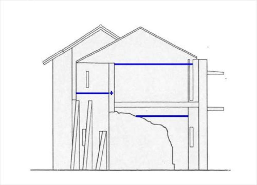 - contribuire, con la presenza di ancoraggi anche nella parte inferiore dell’edificio e considerando un possibile cedimento differenziale del terreno sottostante, a trasferire parte del carico alla porzione di muratura che sembra godere di maggiore stabilità.