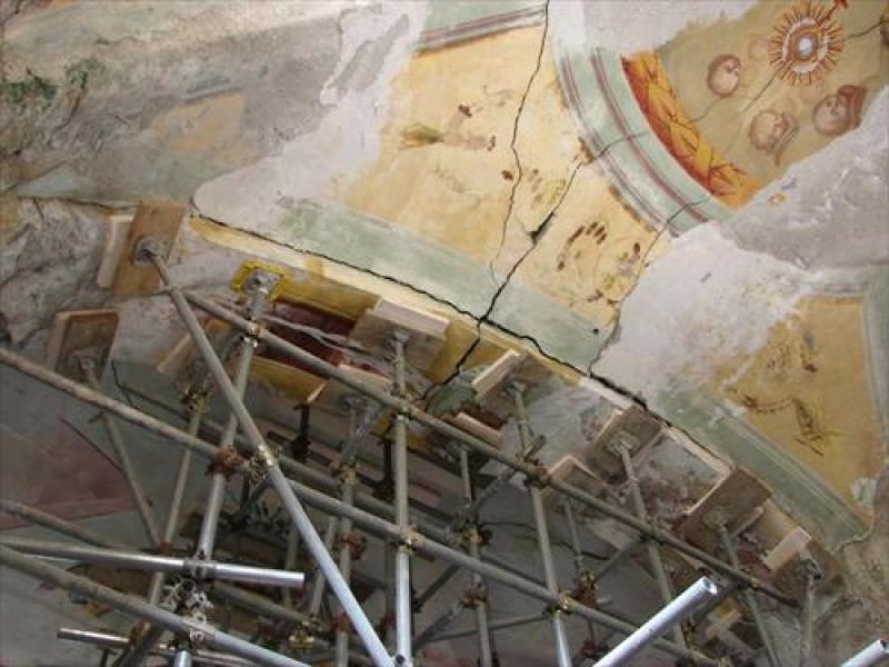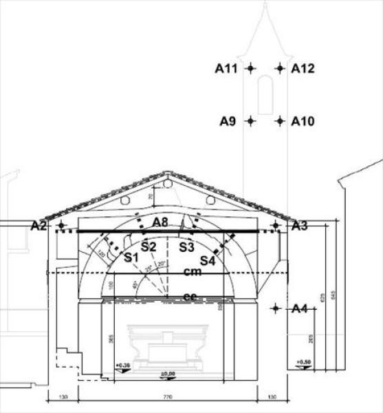 L’intervento di consolidamento è stato eseguito introducendo nuovi incatenamenti (C3) ad integrazione di quelli esistenti per il contenimento delle spinte dell’arco trionfale e ancoraggi iniettati nello spessore della muratura a costituire una cerchiatura globale dell’intera fabbrica (A1-A8). Gli interventi sul corpo principale della Chiesa sono stati integrati con cuciture radiali in corrispondenza dei dissesti dell’arco trionfale (S1-S4). A completamento dell’intervento, in corrispondenza della muratura perimetrale della torre campanaria, ancoraggi di cucitura a diversi livelli (A9-A12). L’intervento rappresenta un esempio particolarmente significativo per le trattazione delle problematiche che interessano il campo degli ancoraggi iniettati nelle murature storiche, in particolare l’applicazione di differenti tecniche di ancoraggio ha permesso di risolvere diverse problematiche di carattere strutturale ricercando, per ogni singolo intervento, la soluzione che meglio potesse garantire un giusto compromesso tra sicurezza e conservazione.