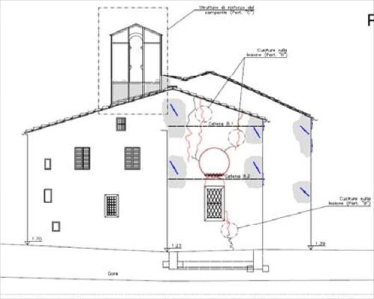 • ancoraggi verticali attivi ciechi iniettati con calza per consolidamento torre campanaria - lunghezza 6,00m - inseriti nello spessore della muratura, con iniezioni effettuate dalla sola testa dell’ancoraggio e successivo posizionamento temporaneo di piastra di ancoraggio all’estremità;