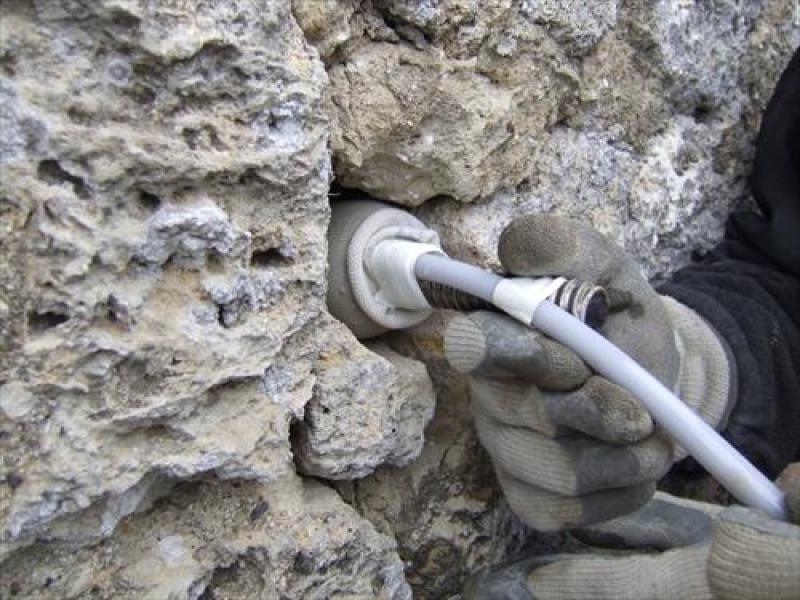 ANCORAGGI > mod. GBOS 24-70 P costituiti da barra tipo GBOS 24/304 in acciaio inossidabile AISI 304  con filettatura continua su tutta la lunghezza, complete di calza per il controllo dell’iniezione della malta, appositi tubicini di iniezione, connessioni (manicotti di giunzione) in acciaio inossidabile AISI 316 (A4) e malta Presstec specifica per iniezioni con calza