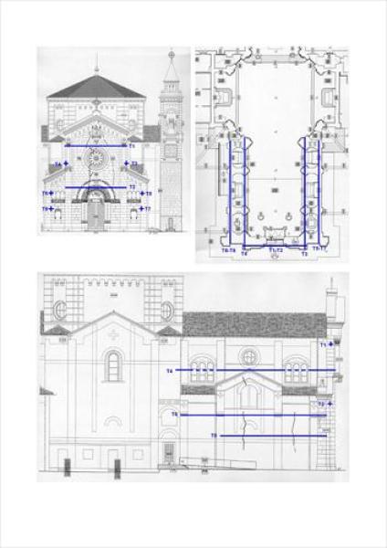 I principali problemi di carattere statico hanno interessato la navata centrale e la facciata della chiesa; estese lesioni verticali sono state rilevate anche in corrispondenza delle pareti perimetrali.