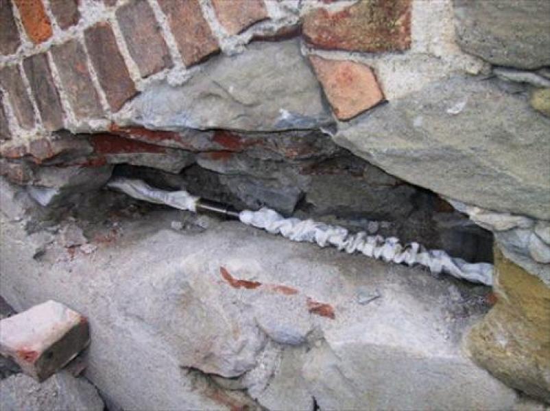 L’intervento di consolidamento delle strutture in muratura è stato realizzato con tecnologia Bossong mediante l’inserimento, all’interno dello spessore dei muri, in appositi perfori realizzati con carotatrici continue, degli elementi di rinforzo in acciaio e la successiva iniezione di materiale consolidante allo scopo di: