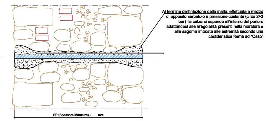 Nell’ambito dell’intervento di recupero del fabbricato dell’Ex Dogana, prospiciente la zona del porto di Napoli, si è reso necessario il consolidamento di parte delle murature esistenti attraverso l’inserimento di diatoni e di diatonos (con svaso alle estremità) trasversalmente allo spessore della muratura. Principale obiettivo, migliorare il comportamento dei maschi murari attraverso il collegamento tra i diversi paramenti che li costituiscono. Trattandosi di murature costituite principalmente da elementi in tufo che raggiungono spessori importanti anche fino a 2,00 metri, sono stati installati diatoni GBOS 16-40 P in perfori del diametro di 40 mm e diatonos GBOS 16-40(90) P in perfori di diametro 40 mm, svasati alle estremità in modo da raggiungere il massimo diametro esterno di 90 mm.