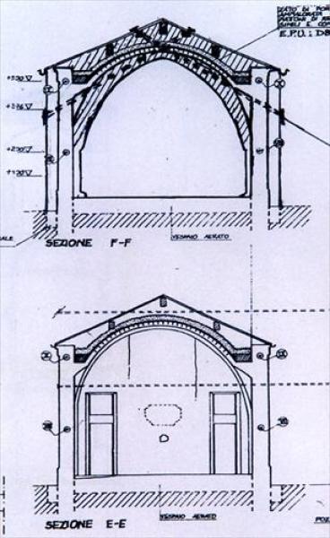 Per il consolidamento dell’arco ogivale del presbiterio si è previsto un intervento con ancoraggi diagonali tangenti alla superficie dell’arco e incrociati in corrispondenza del punto di chiave.