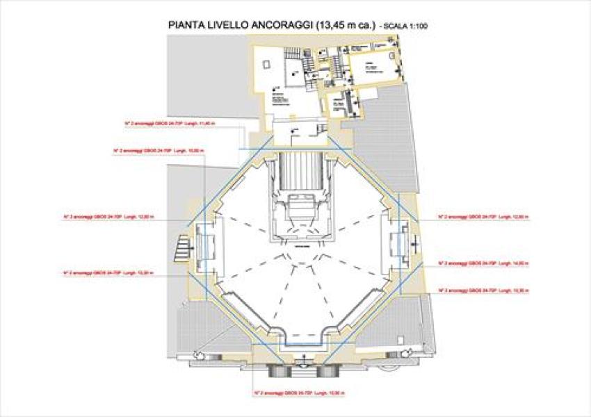 - ancoraggi passivi orizzontali passanti iniettati con calza per la cerchiatura completa della muratura della cupola ottagonale - lunghezza totale variabile da 10,30 m a 14,00 m - inseriti nello spessore della muratura, costituiti da due ancoraggi con calza collegati con manicotto di giunzione ed iniezioni effettuate dalla sola testa dell’ancoraggio libera non utilizzata per l’assemblaggio e successivo posizionamento di piastre di ancoraggio all’estremità;