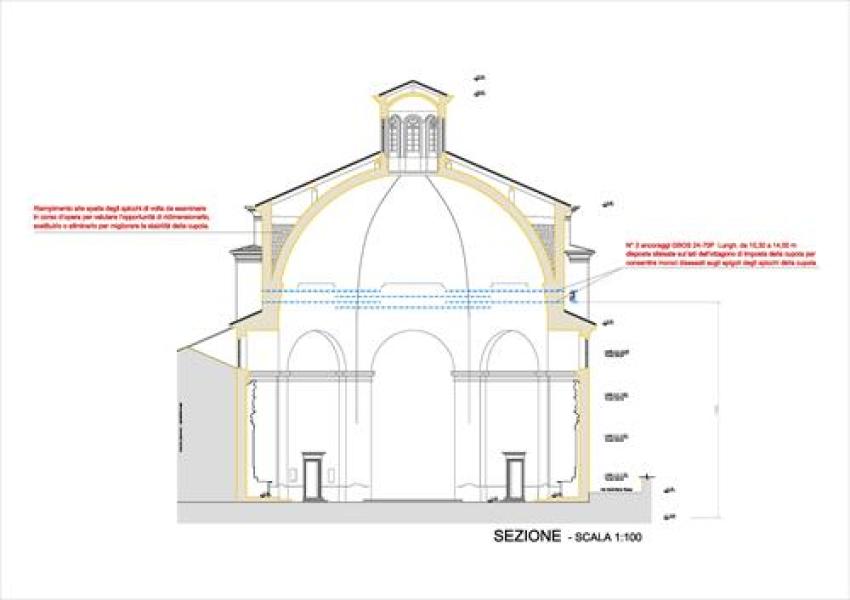 L’intervento di consolidamento con l’applicazione della specifica tecnologia Bossong prevede la totale cerchiatura della cupola ottagonale attraverso l’inserimento di ancoraggi iniettati con calza, per una lunghezza di circa 10-14m; il posizionamento degli elementi consolidanti, alla quota di imposta degli archi di tutti i lati dell’ottagono e a livelli sfalsati, ha permesso l’incrocio in corrispondenza di ciascuno spigolo degli spicchi della cupola.