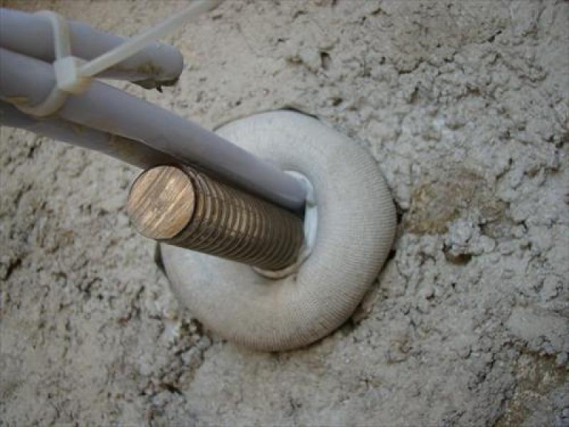 ANCORAGGI > mod. GBOS 24-70 P costituiti da barra tipo GBOS 24/304 in acciaio inossidabile AISI 304 con filettatura continua su tutta la lunghezza, complete di calza per il controllo dell’iniezione della malta, appositi tubicini di iniezione, connessioni (manicotti di giunzione) in acciaio inossidabile AISI 316 (A4) e malta Presstec specifica per iniezioni con calza